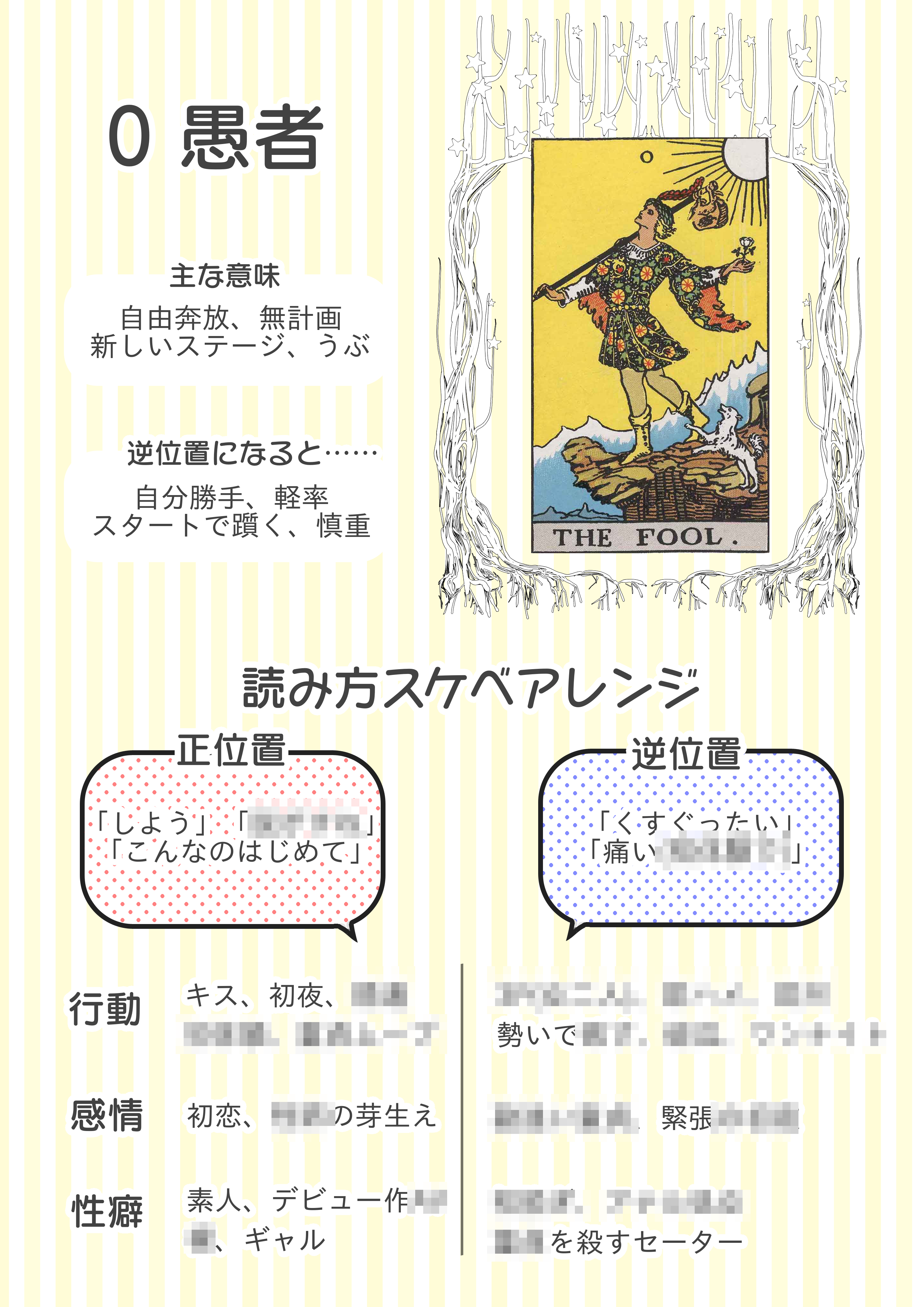 タロットのスケベなリーディングをお助けする本です。 「推しくんのオカズが知りたい…」 「推しカプは普段どんな夜の生活を送ってるの?」 「これからスケベ占いをはじめたい!」 という方にとってもおすすめの本です。 痒い所に手が届くドスケベな一冊! 内容は22枚の大アルカナがそろっています。 更に冊子版はスケベ占いのスプレッド数種+解説付き!